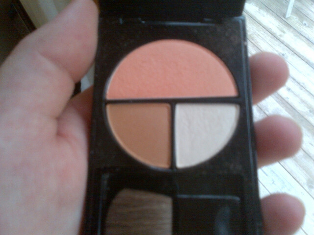 I started by lightly sweeping the brown shade just below my cheekbones. The color looks much darker in the pan than it does on the skin. I swept on a couple of layers and was pleasantly surprised by how subtle the shade was. Next, I applied the peach shade. The palette recommended applying this shade to the apples of the cheeks, which I did, but I also swept it all the way up my cheekbones, blending back to my hairline. As with the brown shade, this pretty peach color swept on lightly and I was able to build up to the perfect peachy glow. Depending on your mood and preferences, you could choose to go dramatic with the color with lots of layers, or go ultra-subtle with a quick swipe and call it good. To finish off the look I gently tapped the highlighter shade just above my cheekbones. The instructions were easy enough to follow, and the powder spread evenly on my skin. So far, so good.