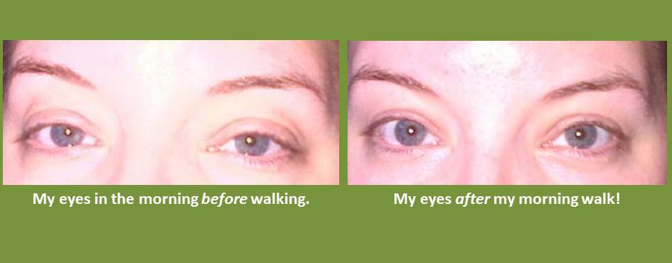 2. Walk it off. Whether you occasionally suffer from puffy, tired-looking eyes or your brighter-eye battle is a lifelong one, you’ve probably wondered what you can do to de-puff your eyes, fast. Here’s the secret: go for a walk. Even a ten-minute walk will get blood pumping and excess fluid moving away from your face. I recently started going for early morning walks and was thrilled to discover this side effect. Want proof? Check out these before and after photos: